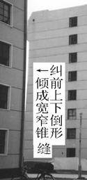 采用掏土灌水法設計施工的該項工程,糾傾工作共進行了2個月。各觀測點傾斜值全部已回至規范要求范圍,內外縱墻原有裂縫大部分已閉合。從糾傾前照片可以看出,傾斜樓房山墻與鄰近參照建筑物墻體間在垂直方向上形成了上寬下窄的倒錐形縫,糾傾后建筑物與參照建筑物間的倒錐形縫已閉合(圖2)。