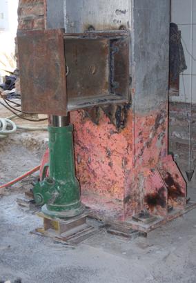 由于礦井凍結(jié)法施工造成后期井口附房產(chǎn)生較大沉降,影響了上部結(jié)構(gòu)的使用。采用頂升法對鋼結(jié)構(gòu)廠房中的沉降較大的鋼柱進(jìn)行糾偏,該方面需要在鋼柱腹板上焊接鋼牛腿提供頂升支點,同時對鋼柱底部預(yù)埋的螺栓桿體加長,每個鋼柱兩側(cè)設(shè)置兩個頂升千斤頂,經(jīng)過頂升糾偏后該鋼結(jié)構(gòu)廠房基本恢復(fù)原狀。