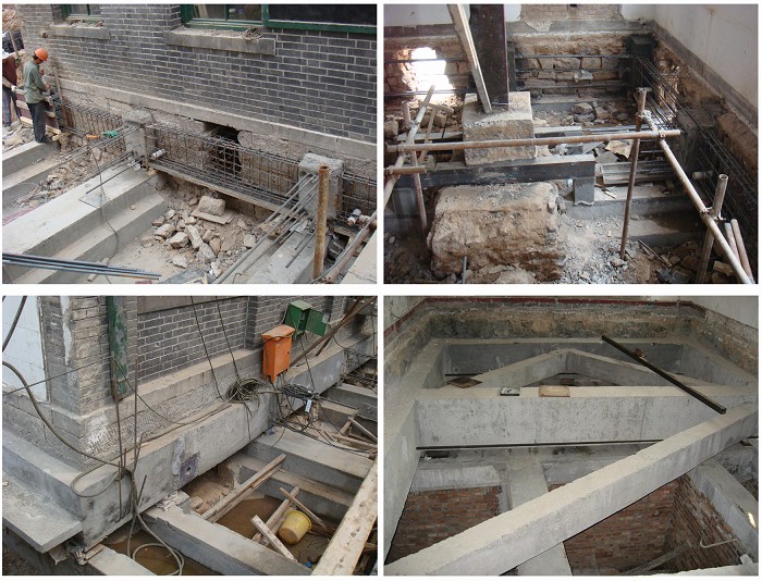 考慮到該建筑物整體性較差,不宜在墻下直接托換,而采用對上部結(jié)構(gòu)影響較小的雙梁式托換,同時為了確保托換結(jié)構(gòu)的整體性和對上部結(jié)構(gòu)荷載的有效傳遞,墻兩側(cè)的托換梁每隔1.5m左右就增加了一根連接短梁,并且在各軌道梁之間增加了水平斜撐。