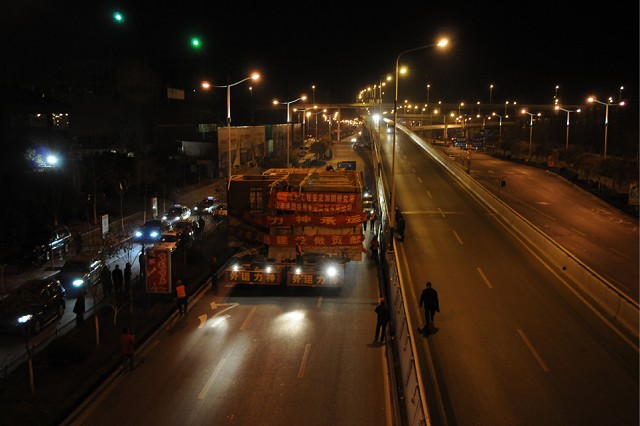 此次遷移使用法國NICOLAS自帶動力大型液壓平板拖車,此次拖運共使用2列20組車板,車輪共計128個。