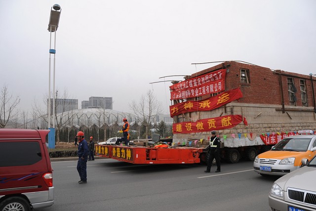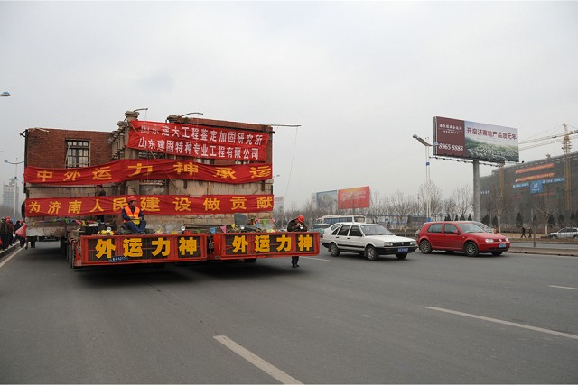 該建筑原位于繁華市區,為了盡量減輕道路交通壓力, 對運輸線路進行了詳細勘察,遷移于3月1日21:38分開始,遷移過程中,老別墅四次屈身過街天橋,三過立交,于3月2日11:43安全到達山東建筑大學新校區。整個遷移過程歷時14小時,遷移距離為30公里。