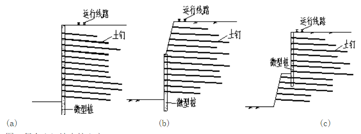 考慮到工程場(chǎng)地周邊條件(南側(cè)緊靠運(yùn)行線路)和地質(zhì)條件(上部填土較厚),考慮到工程對(duì)安全、工期和經(jīng)濟(jì)的要求,綜合考慮決定采用微型樁+土釘錨桿的復(fù)合土釘墻支護(hù)方案。這種形式的復(fù)合土釘墻有三種類型,不同工程技術(shù)人員對(duì)不同方案表達(dá)了支持意見,現(xiàn)分述如下: